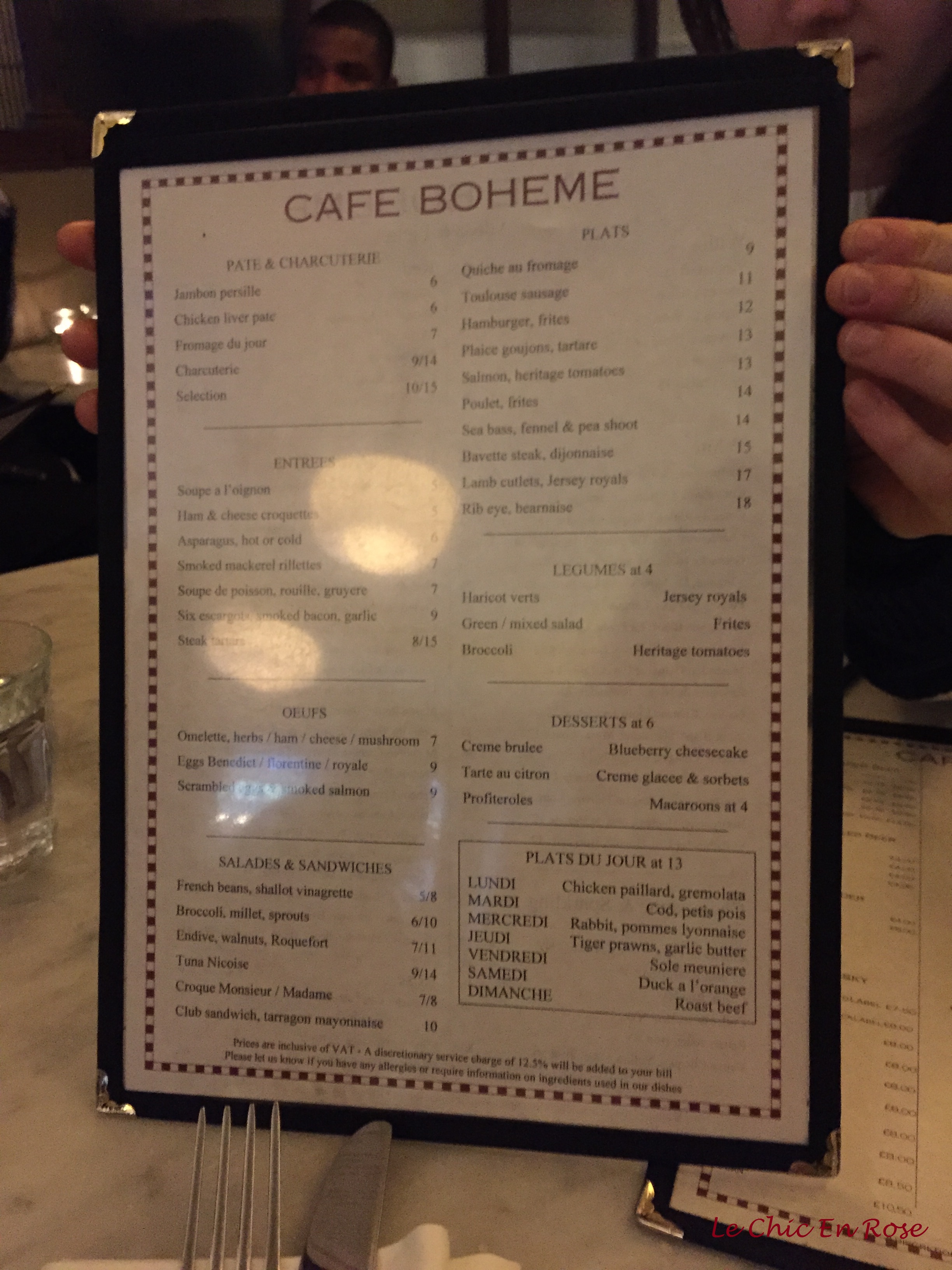 Cafe Boheme specialises in authentic French food with such classics as Soupe de Poisson (fish soup) and Escargots (snails!) on the menu. They also offer their Plats du Jour (daily specials), which are highly recommended. Here is the menu in more detail complete with light reflections!