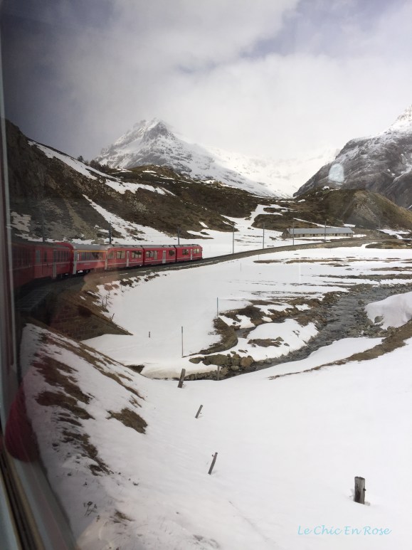 Bernina Express descending to the ski fields of Diavolezza – Piz Bernina in the background