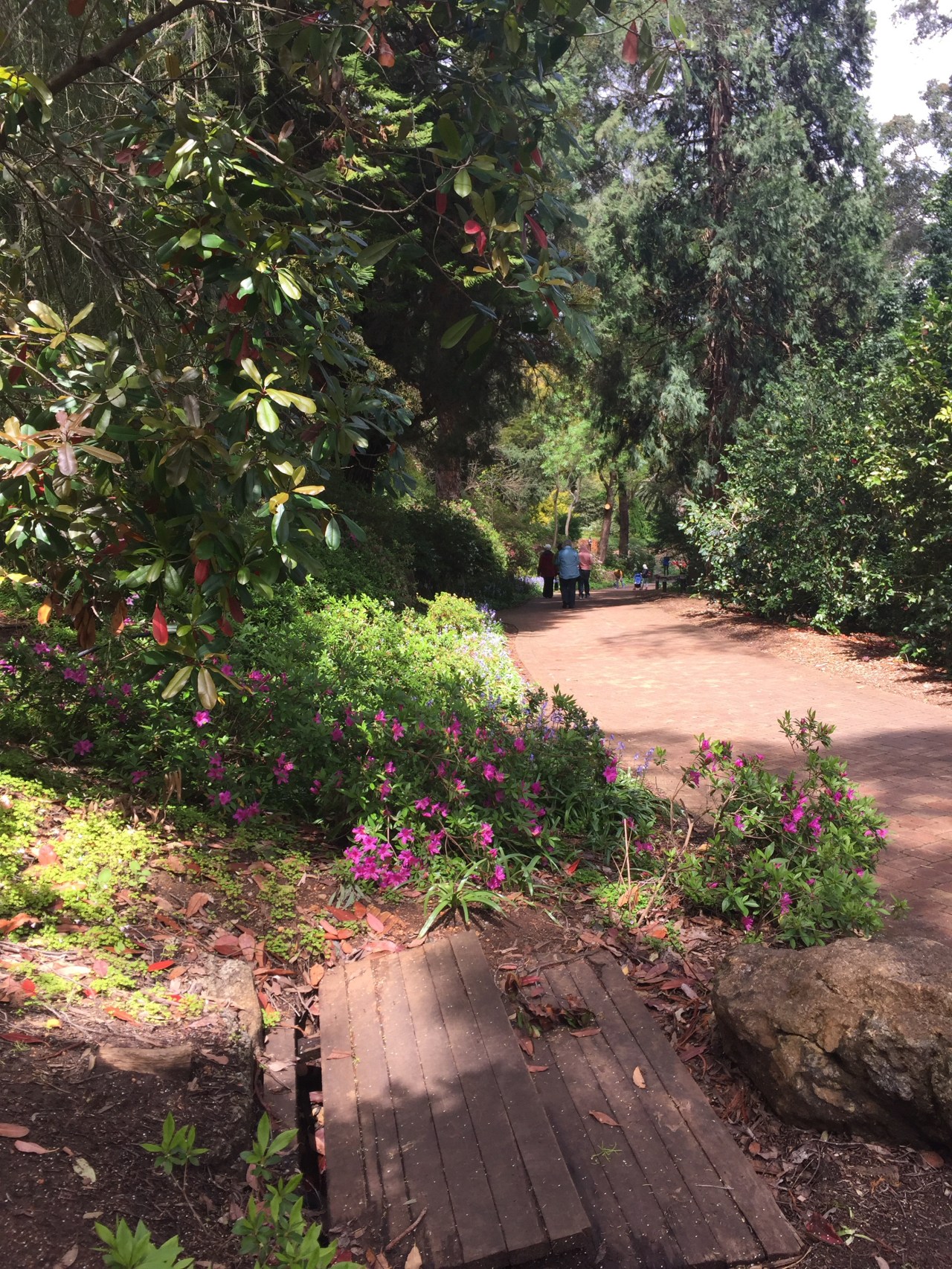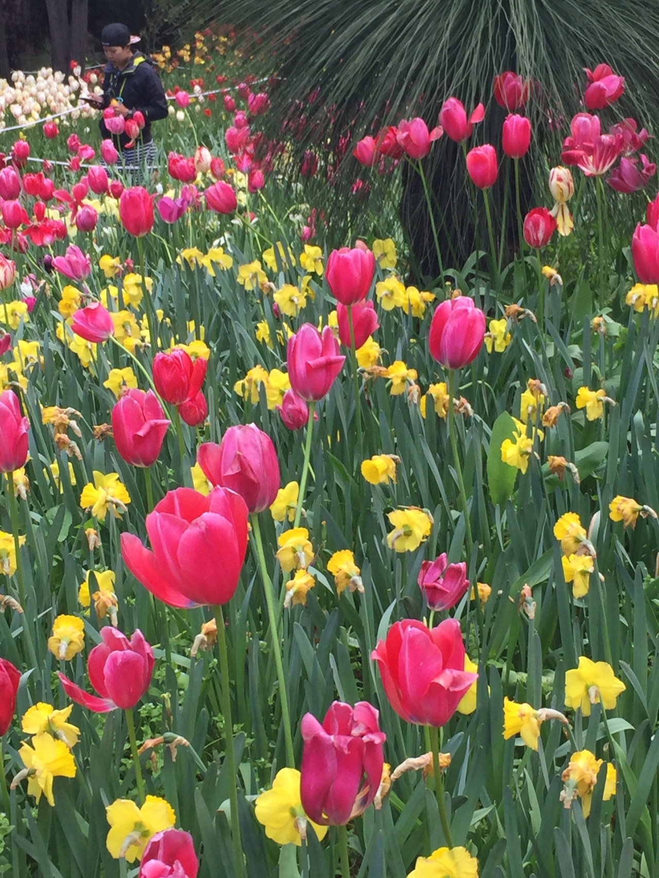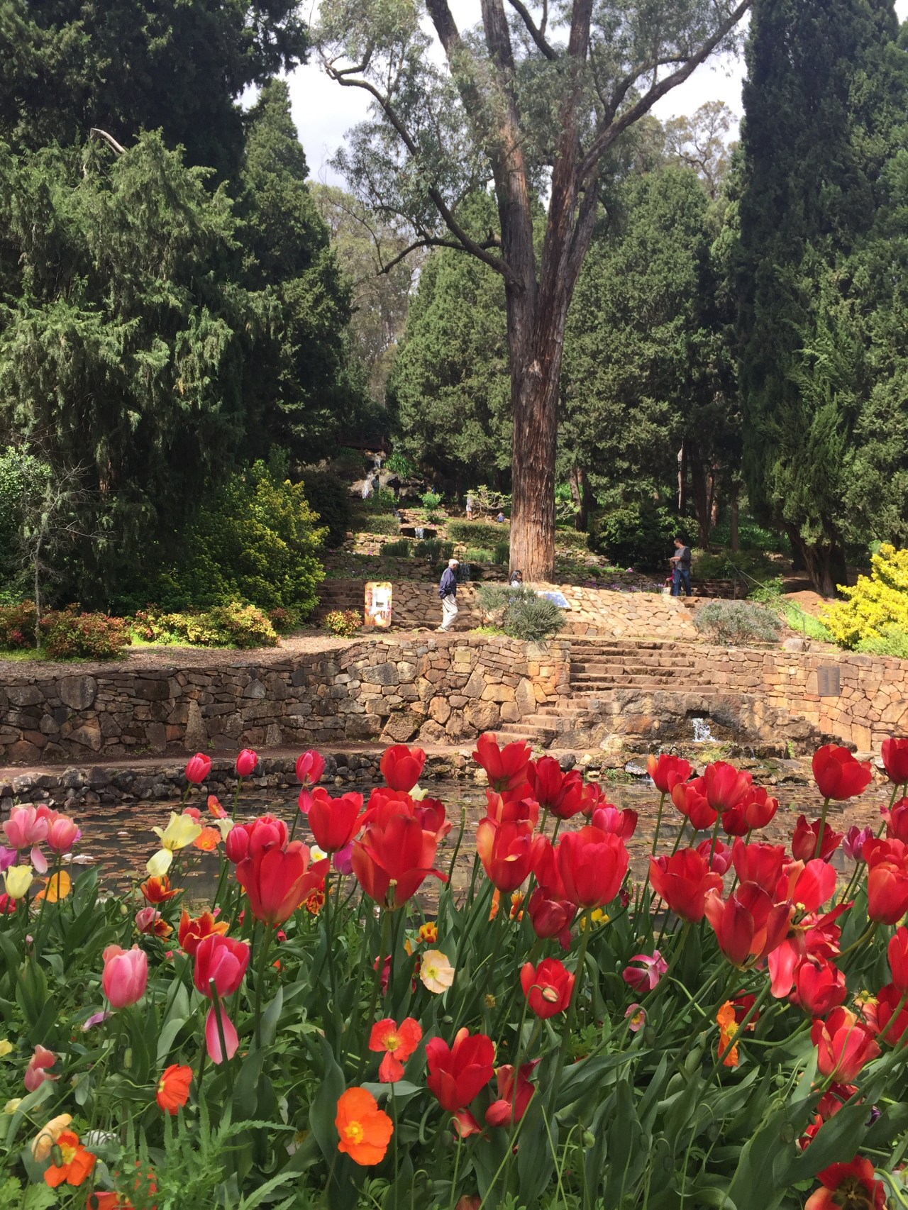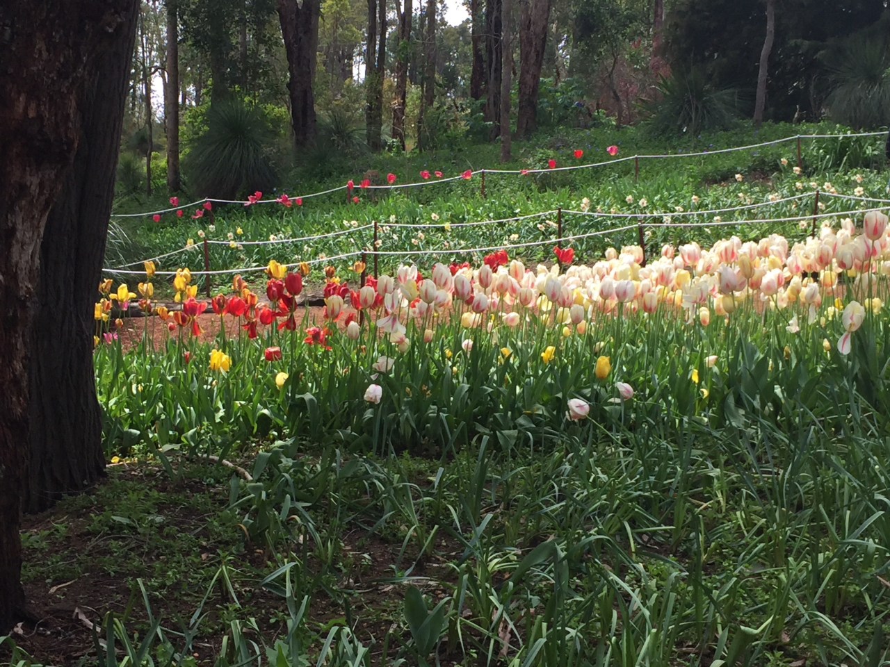 So an abridged version of this week’s planned post! We had a lovely day out at Araluen Botanic Park about 45 minutes south east of central Perth in the hills suburb of Roleystone last month. Spring is always a highlight here with the tulips a big attraction. This year even in October they were not fully out as a result of the colder than average winter we have had. They were still pretty impressive though and the wisteria was magnificent. We took our two granddaughters on the little train, which trundles through the park and admired the extensive collection of camellias and rhododendrons. Chalet Healy makes a great lunch spot and we were also entertained by a Celtic musical band playing in the grounds near the cascading stream. In the meantime here are a few photos from our recent day out. Hopefully my computer will be restored to normal service by next week!