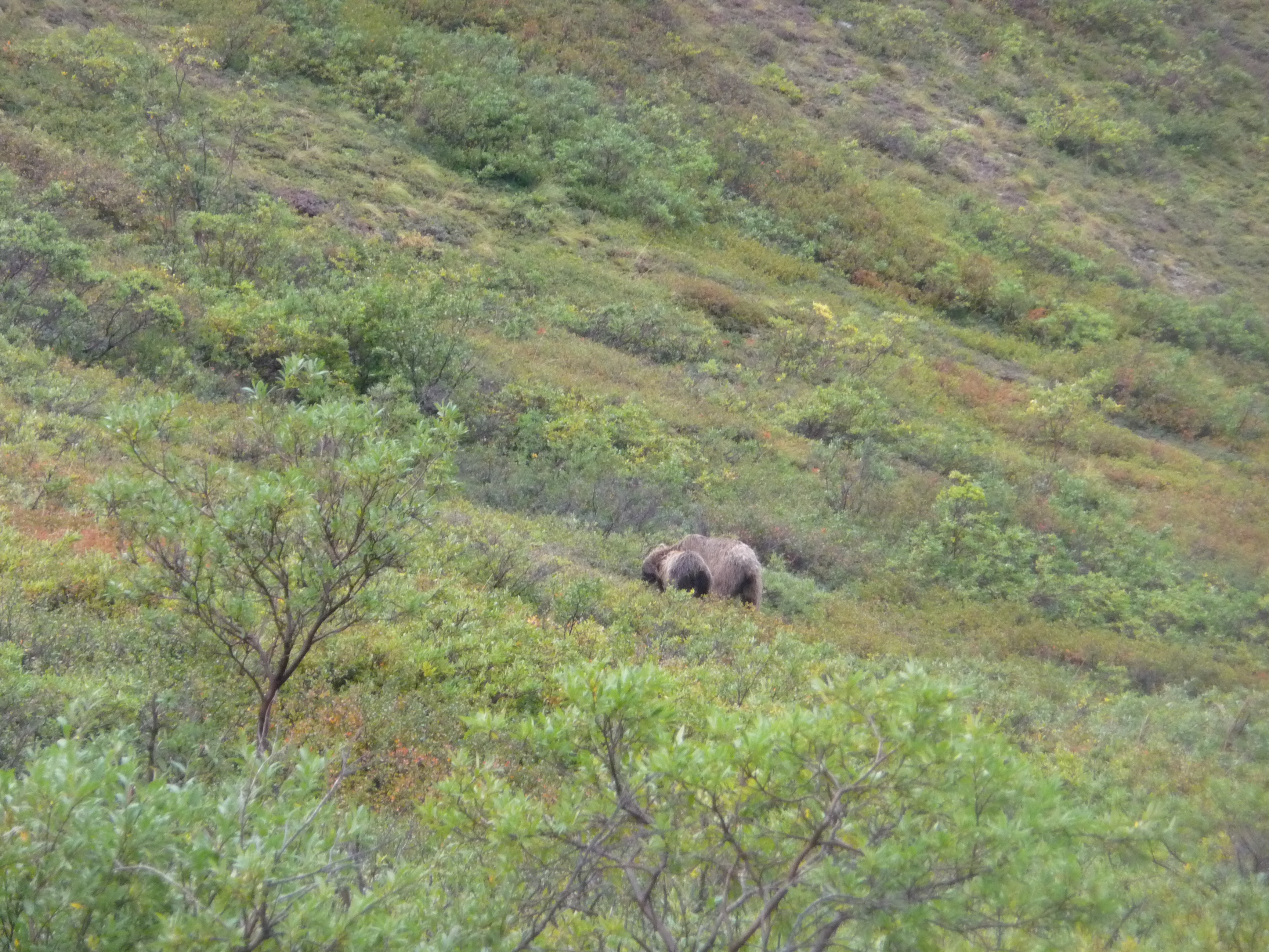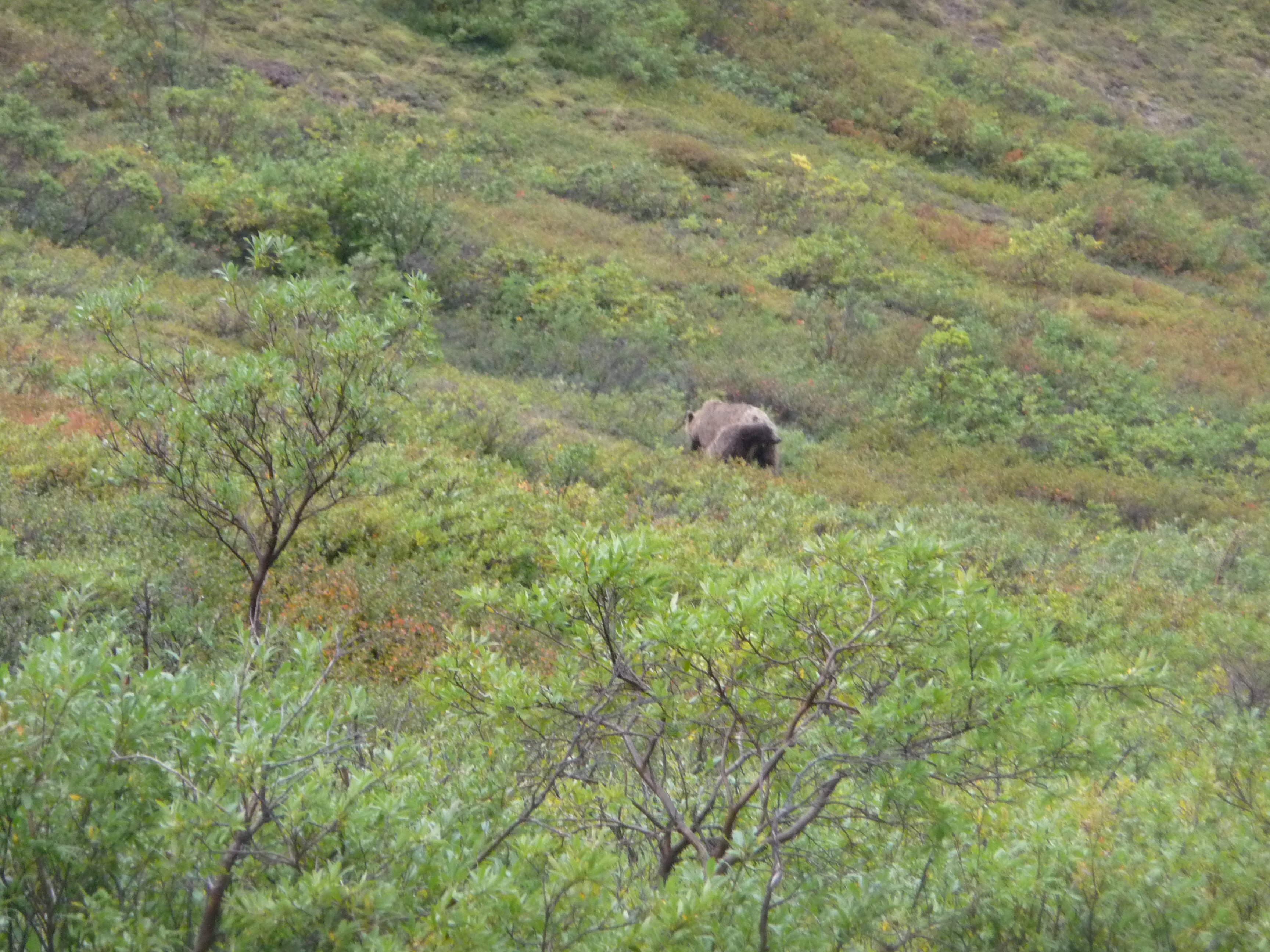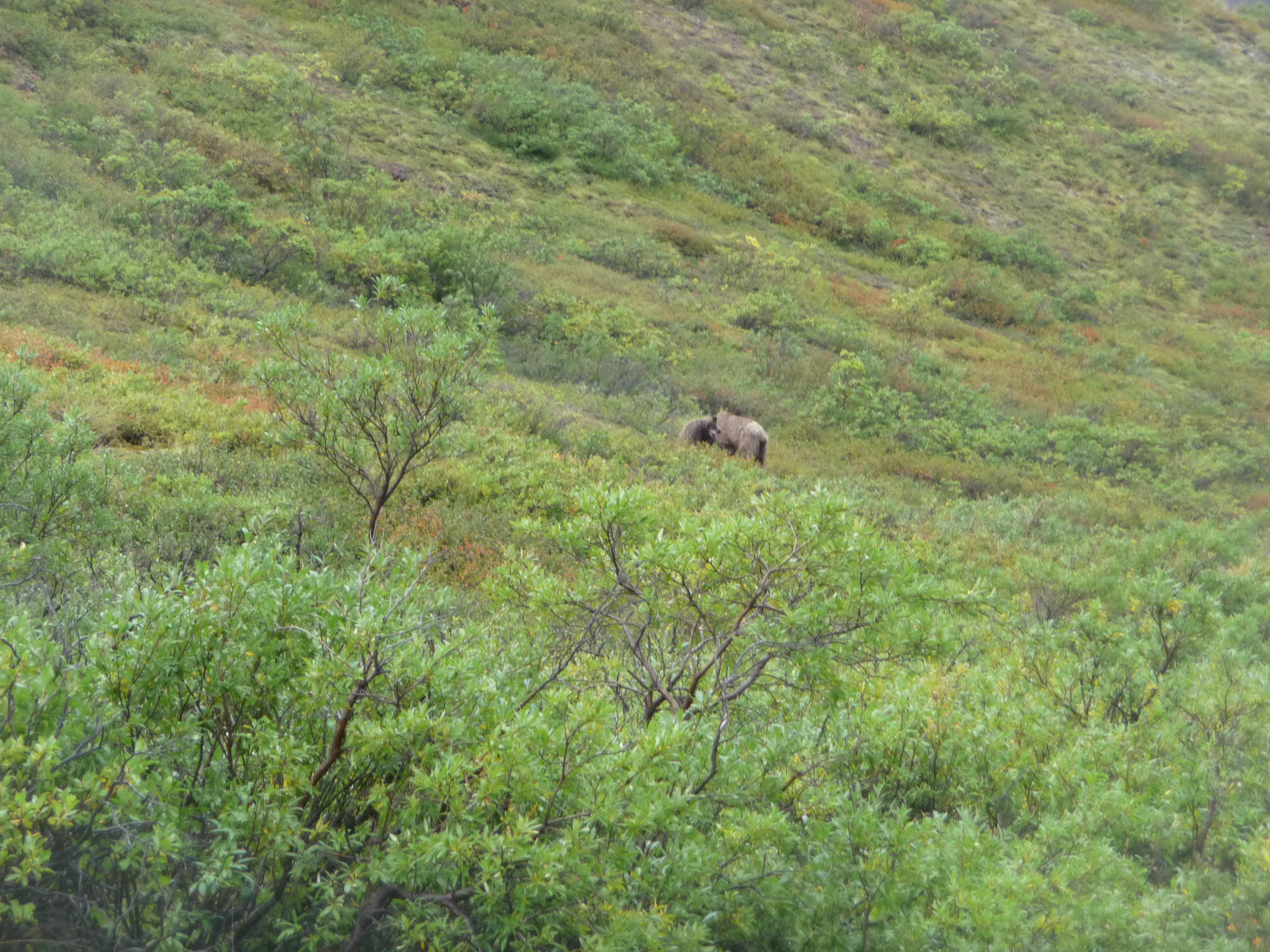 Then after our earlier sighting of the mother grizzly bear and her cub in the morning, we had the thrill of seeing another pair later in the day – hopefully you can just about spot them? Obviously we were some distance away in the safety of the bus!