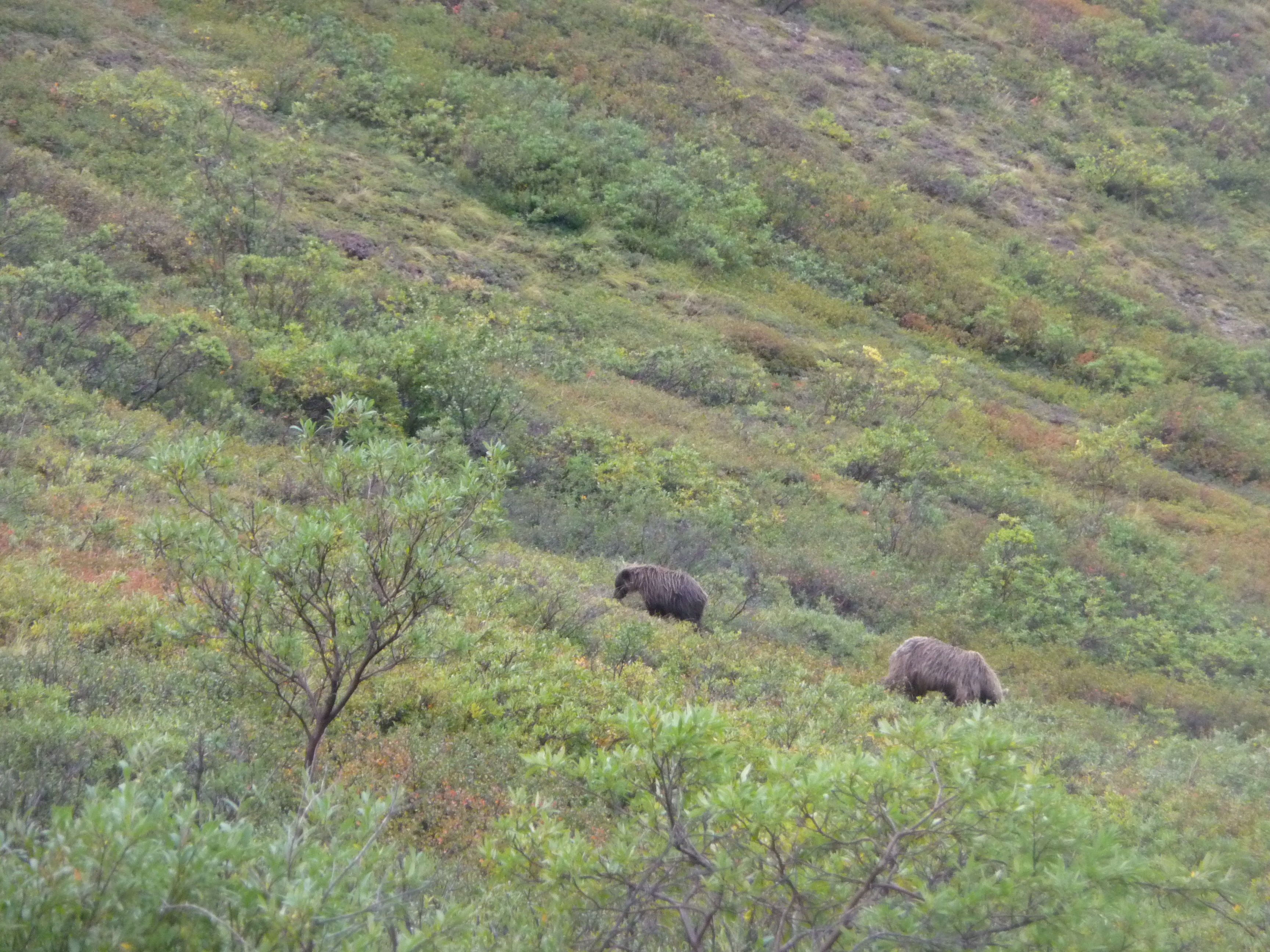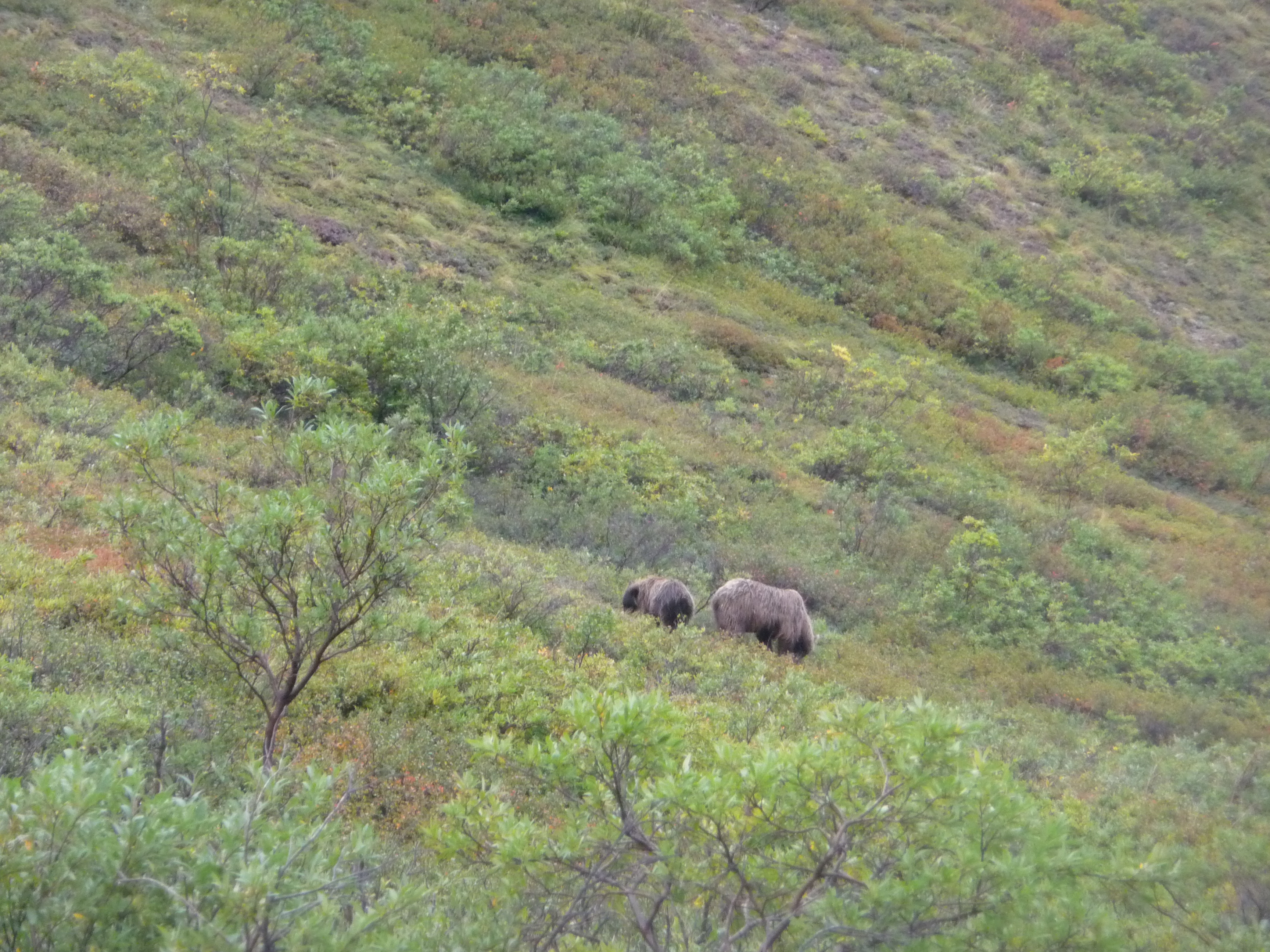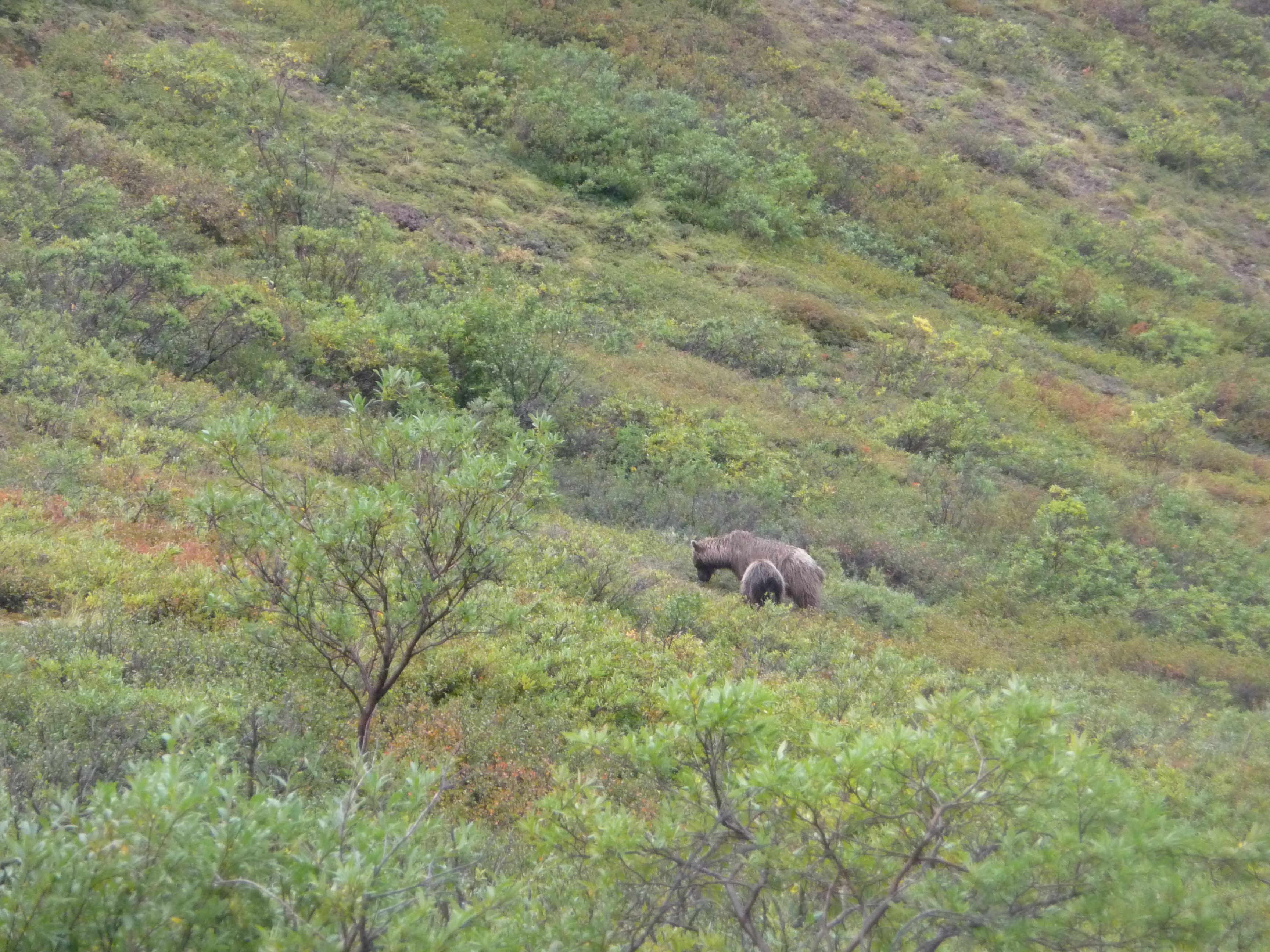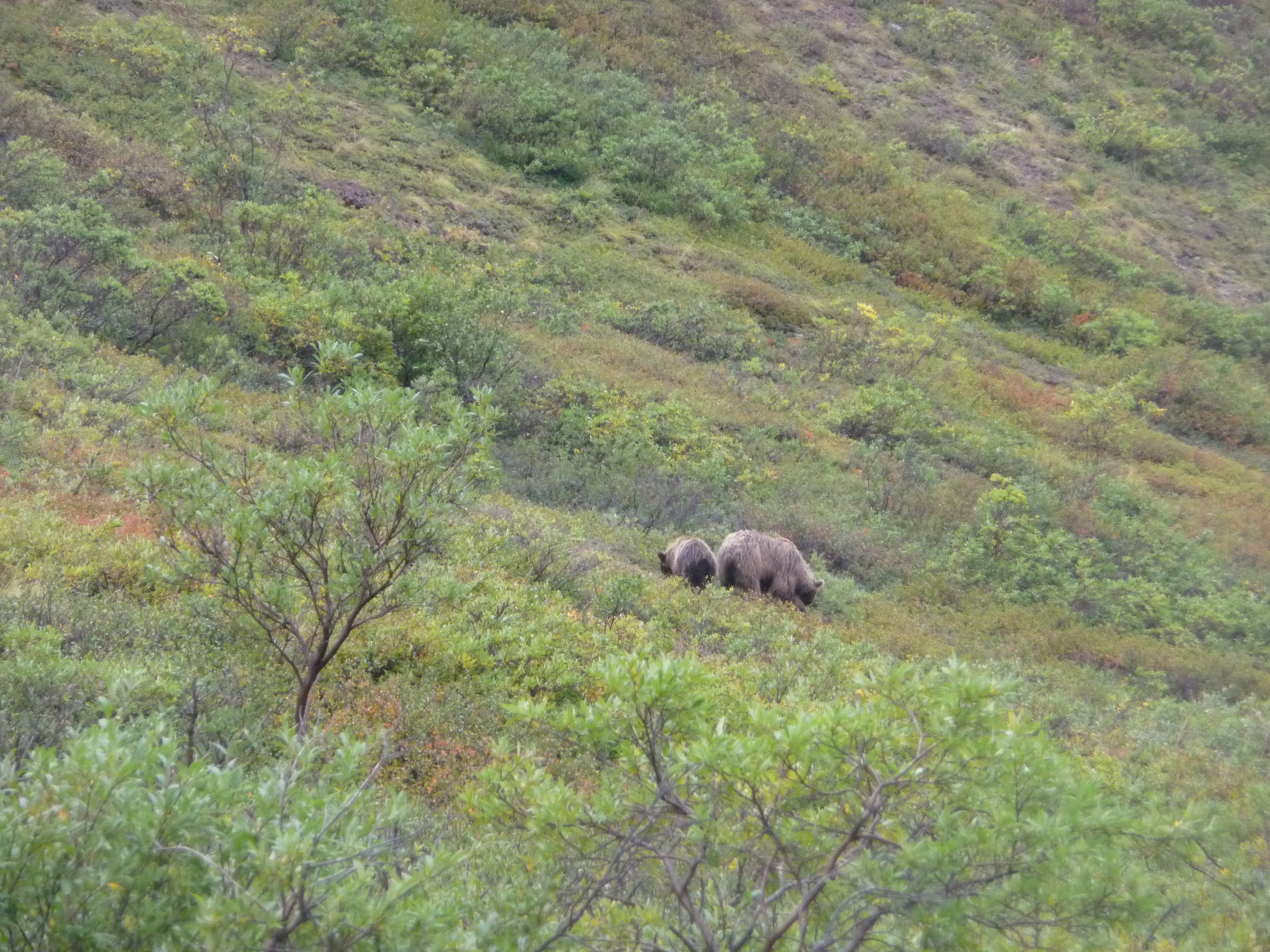 Then after our earlier sighting of the mother grizzly bear and her cub in the morning, we had the thrill of seeing another pair later in the day – hopefully you can just about spot them? Obviously we were some distance away in the safety of the bus!