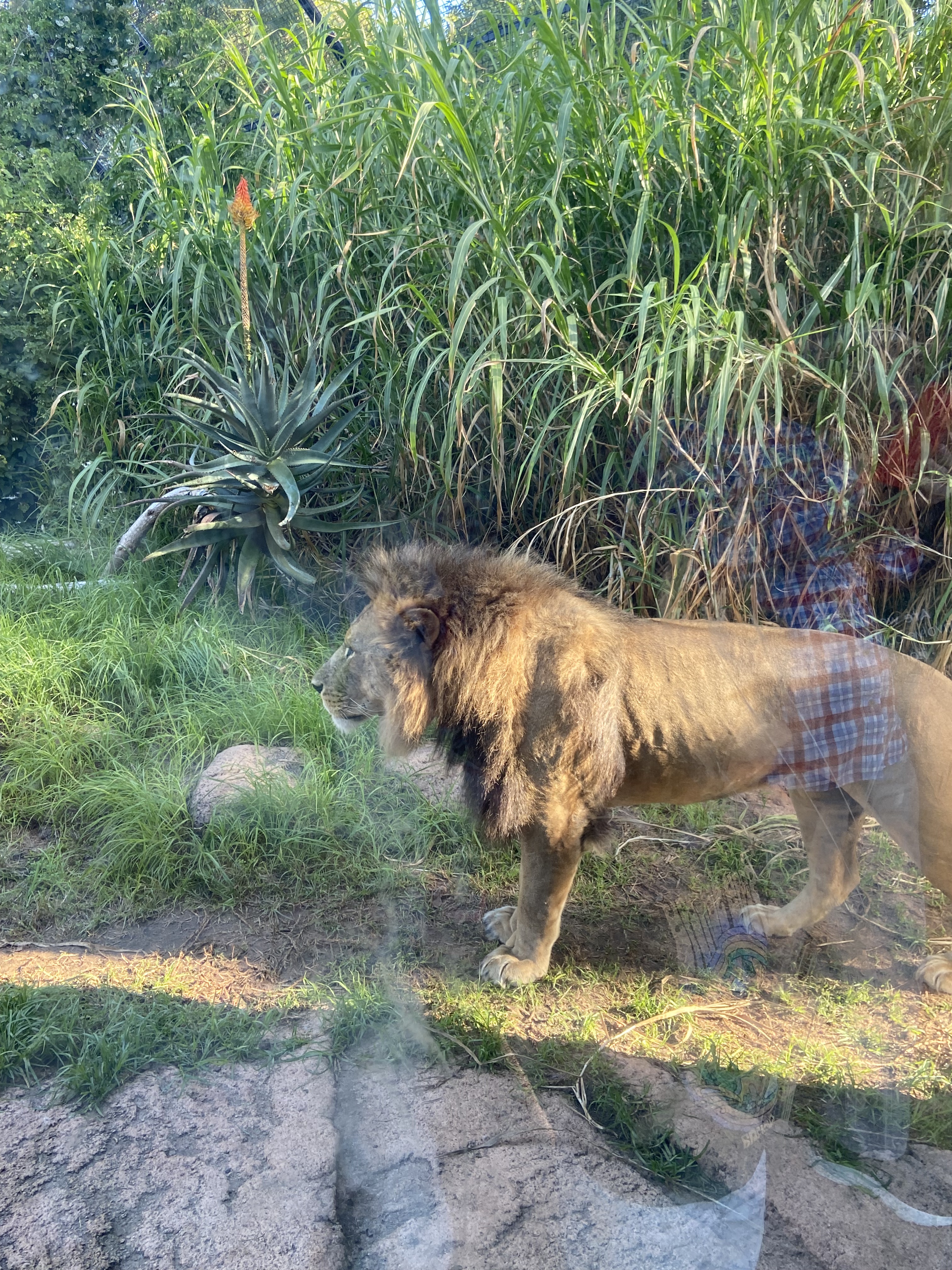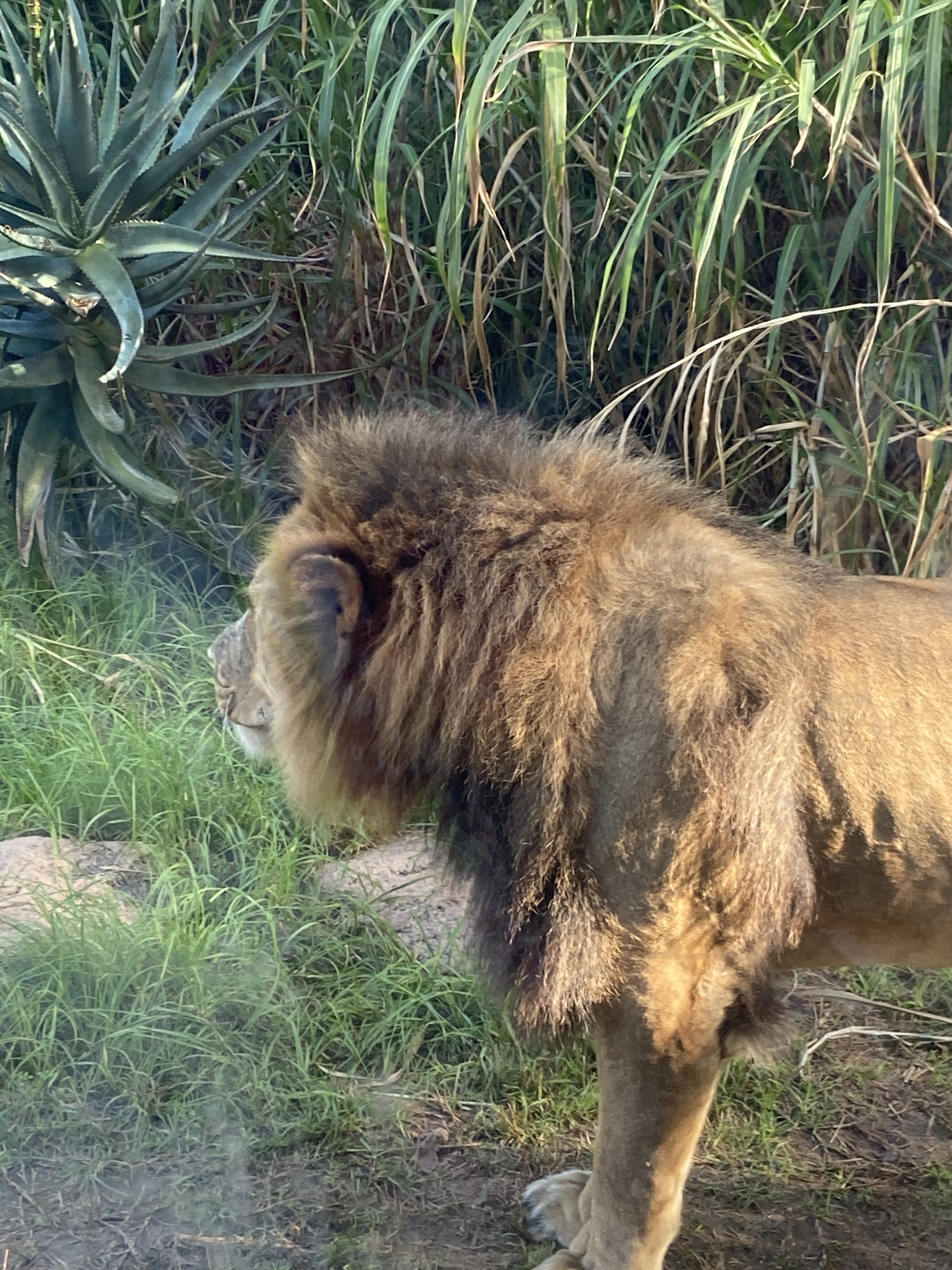 It soon became clear what had attracted the girls’ attention as suddenly just to the side of our viewing spot, out from his neighbouring enclosure strutted Jelani stopping for a little while to have a look at his admiring human audience. He then sauntered off evidently trying to impress Makeba and Uzuri (though I did read later that he is in fact a non-breeding male). After a while he strolled off back to the other side of the lion enclosure.