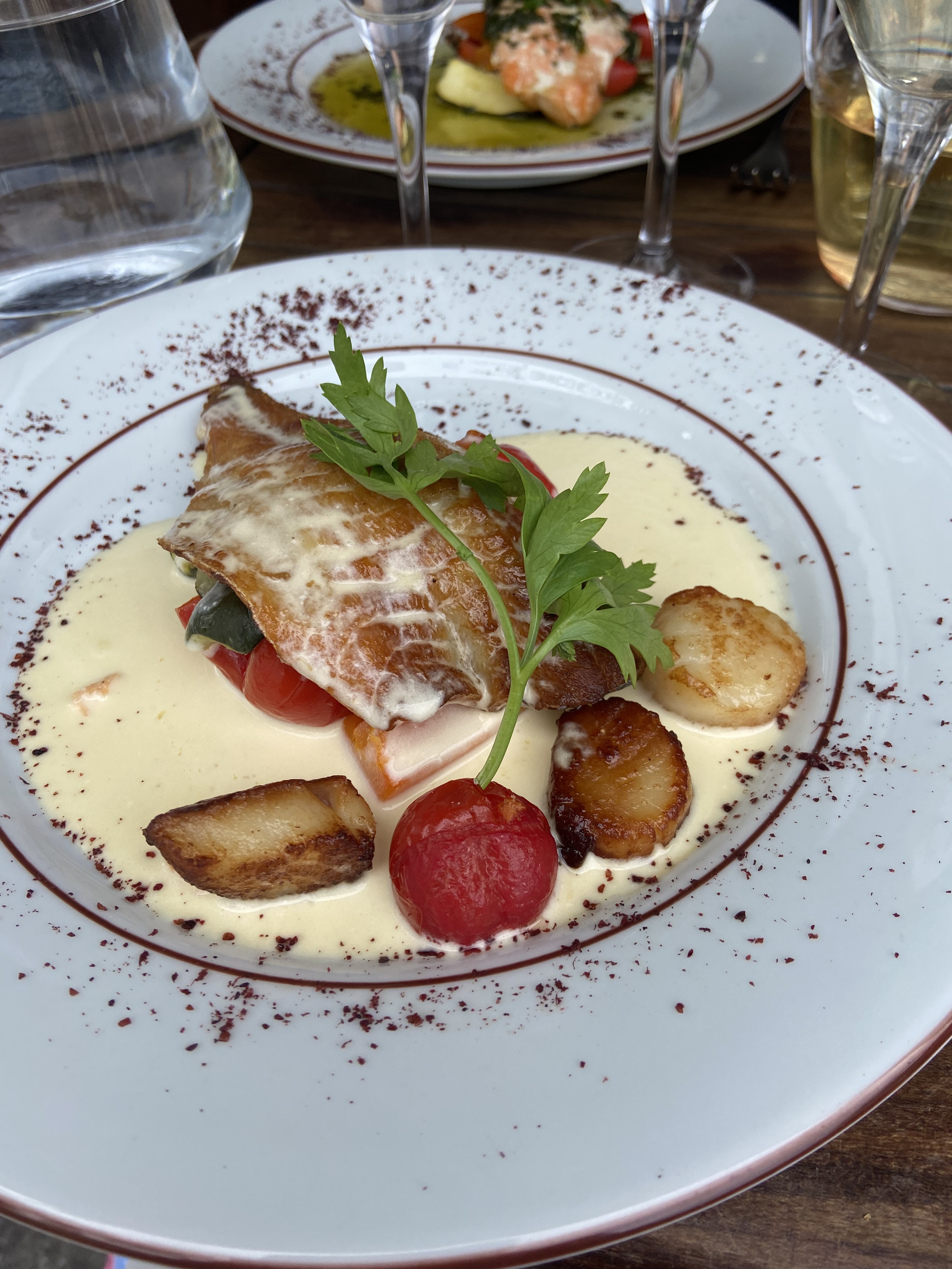 Our first course arrived beautifully presented followed by the equally delicious main courses. I can’t remember all the dishes so am going by the photos. I had the soup of the day for starters and we both enjoyed fish dishes accompanied by various vegetables for the mains – all of a very high standard. By this stage we had the place more or less to ourselves and the wait staff, who were attentive and friendly, humoured me as I attempted to practise my rusty French!