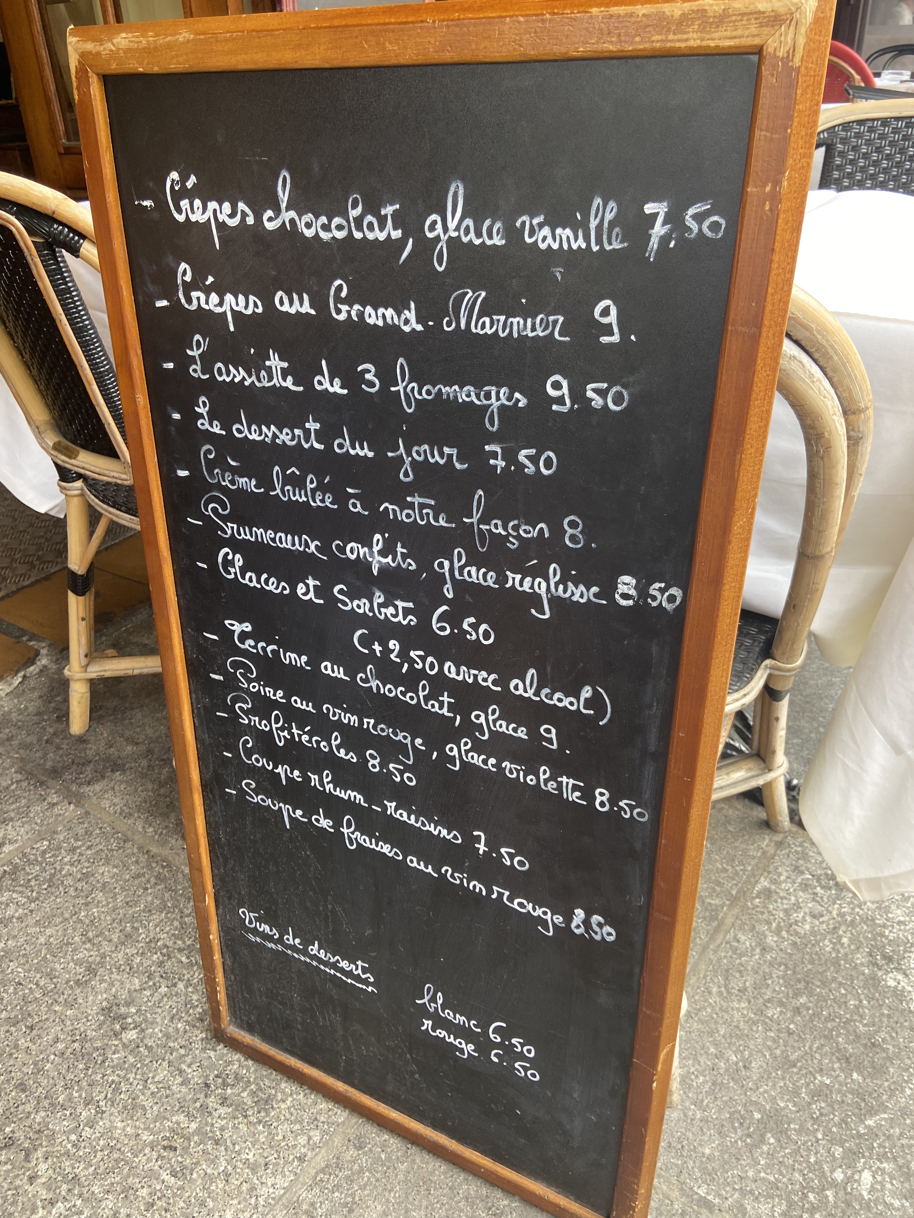 We debated whether we could find room for any more food but when the waiter wheeled over the dessert blackboard with the various selections beautifully inscribed in the classic looping French writing style, we couldn’t resist.The chocolate crepes and double crème brulées (raspberry and passion fruit if I recall correctly) were superb and a wonderful finale to our meal.