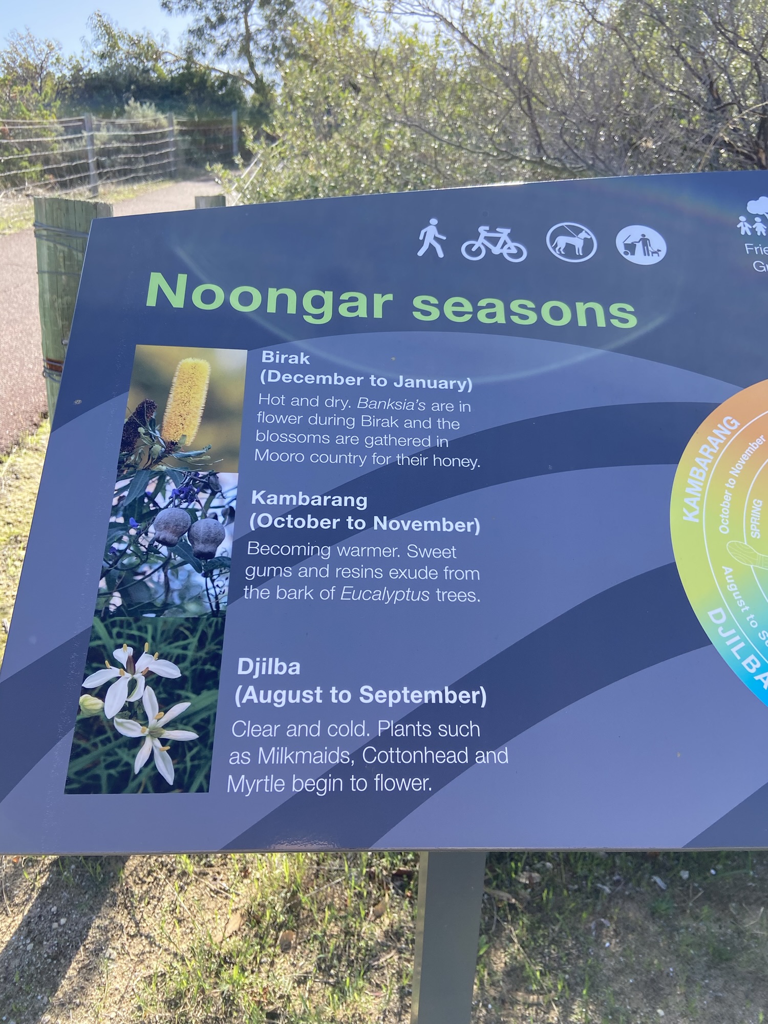 Here is a quick recap: Although we talk about the traditional 4 European seasons, the indigenous Noongar people of South Western Australia have a close connection to the land and weather cycles and chart the changing seasons differently.Their way of life for so many generations has depended on the understanding of the weather patterns at the various times of the year and their influence on nature. This understanding helped them to know the best times to hunt, gather or migrate to other areas. They divided the annual cycle into 6 distinct periods namely Birak (December to January), Bunuru (February to March), Djeran (April to May), Makaru (June to July), Djilba (August to September) amd Kambarang (October to November). You can find more information from the link here.